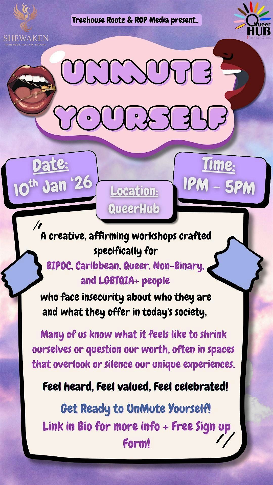 Many BIPOC, Caribbean, queer non-binary, and LGBTQI+ people know what it feels like to shrink themselves or question their worth, often in spaces that overlook or silence their unique experiences. Unmute Yourself was born from the need for spaces where voices are heard, stories are valued, and authenticity is celebrated. This workshop honors the wisdom and resilience present in our communities, offering room to rediscover and reignite the inner fire. This is a chance for people to revisit their journey, nurture their voice, and reconnect to truths that may have been quieted by external pressures. Here, vulnerability is strength, and community is a source of healing - showing up together, learning from each other, and building foundations of trust and pride.