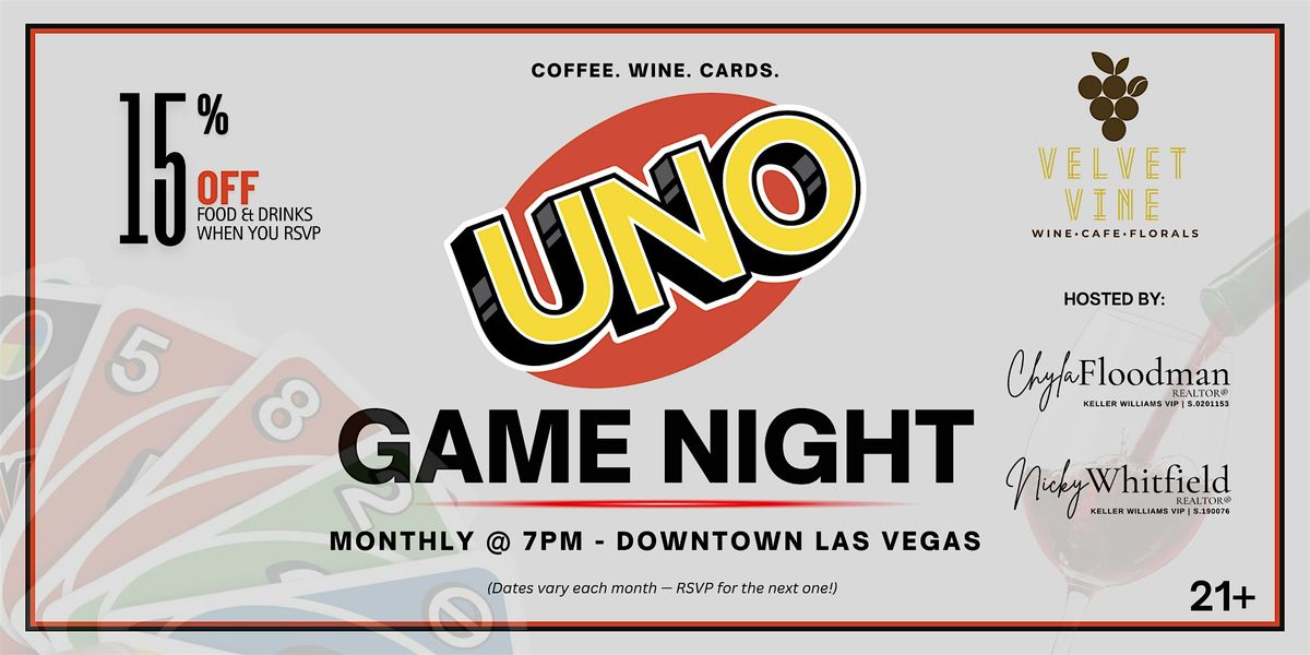 We are hosting at the Velvet Vine Wine, the newest wine bar in downtown! We'll be playing UNO family-style to keep it social, and making it a night to remember.