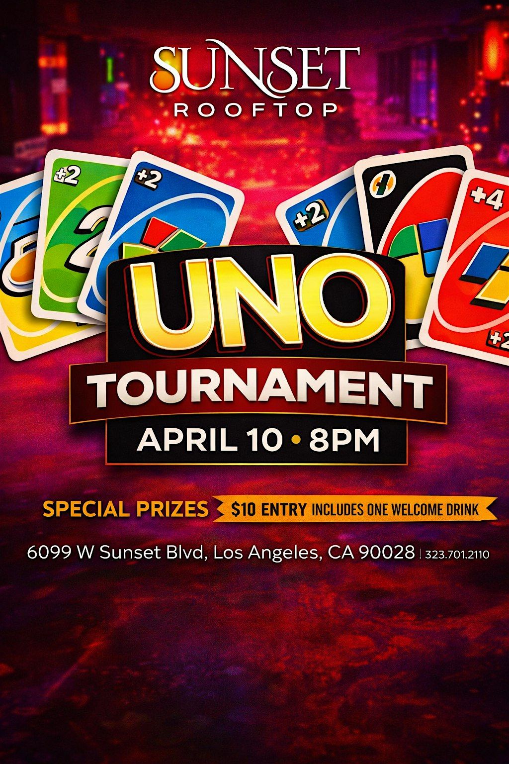 Get ready for a competitive, high‑energy game night at Sunset Rooftop, Hollywood’s favorite hookah lounge. Whether you’re a casual player or a strategic UNO assassin, this tournament is your chance to show out, meet new people, and enjoy a fun night with great vibes .