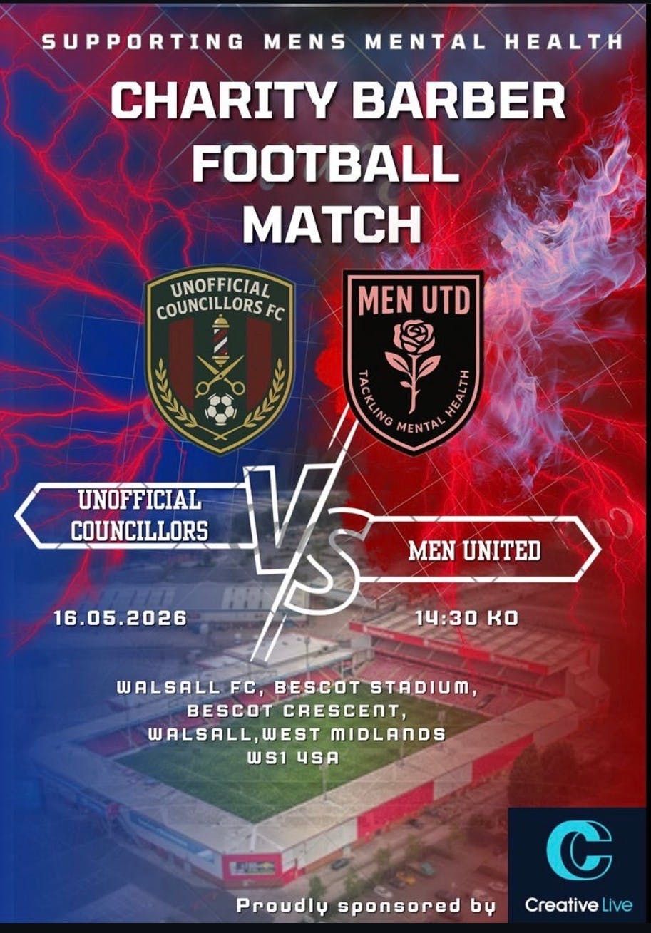 We are raising £10,000 for Mens Mental health charity Samaritan's at Unofficial Councillors Football Club, this is in aid of recognising barbers as a key element to a clients life. Often we stand and listen to our clients regularly and give advice or guidance on their needs and concerns, ultimately we as barbers are "unofficial councillors" a safe space for men to open up and talk. It's often a relationship that no other has.This football game is bringing all barbers together from all walks of life to support the cause and give back to the Charities who support men and women daily through struggles and challenges in life.