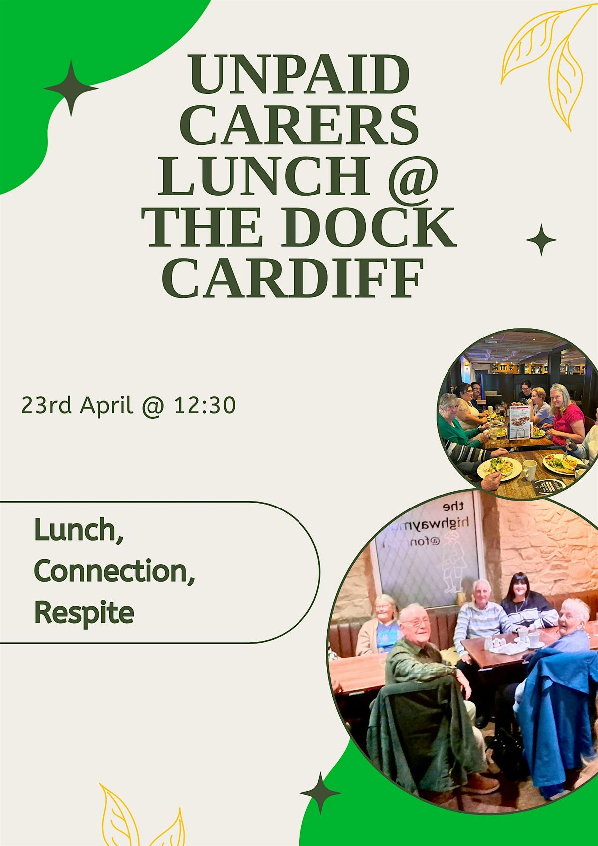 Hey there! If you’re an unpaid carer, come join us for a free lunch at The Dock in Cardiff. It’s a great chance to relax, meet others, and enjoy some good food on April 23, 2026, at 12:30 PM (BST). We’d love to see you there and give you a well-deserved break!