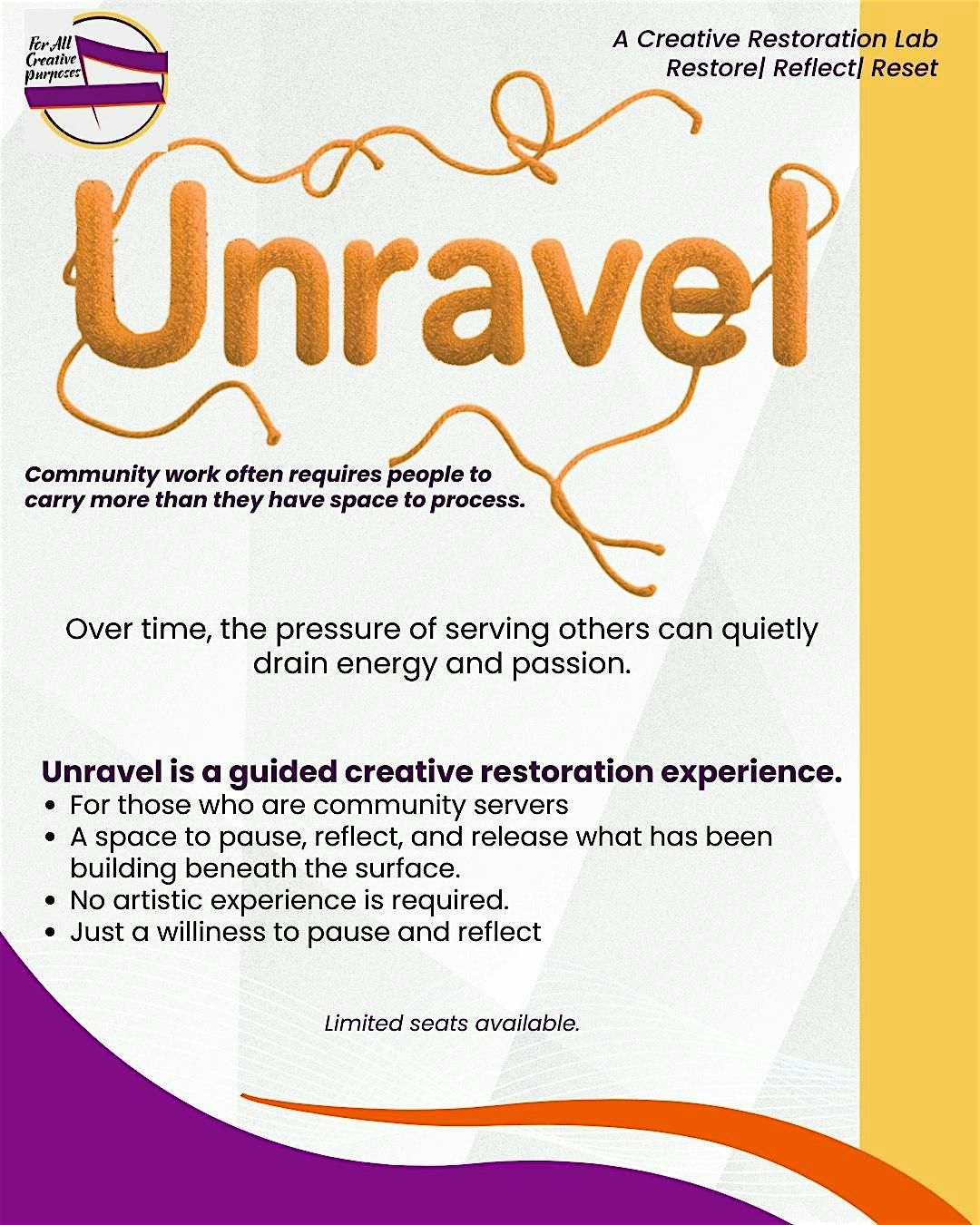 Unravel is a guided creative restoration experience designed for people whose work serves the community. It offers a dedicated space to pause, reflect, and release the emotional weight that often builds beneath the surface of meaningful work.