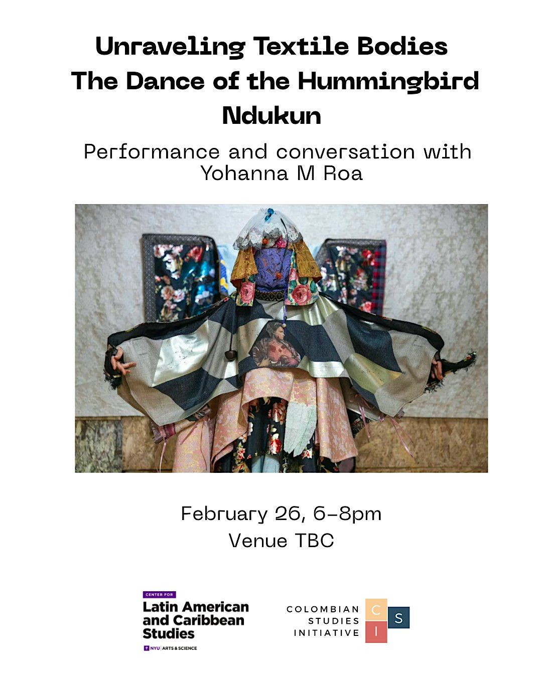 The Open Seam: Torbellino 1—The Dance of the Hummingbird (Ndukun) is a performance by Yohanna M. Roa inspired by a Kogi account of a fifth race—the hummingbird—that transcends color and borders to carry messages of peace. Drawing from torbellino, a dance shaped by Indigenous rhythms and Spanish influences, the performance uses movement and historiographical textile sculptures to explore the fluid intersections of race, nationality, gender, and culture, making visible forgotten and violated bodies. The performance will be followed by a conversation with the artist, moderated by Amalia Uribe Guardiola, on trans- (cultural / border / national / disciplinary) practices in her work, the mechanism of the veil, as well as the unmaking of the book as a colonial device. Refreshments and drinks will be provided at the end.
