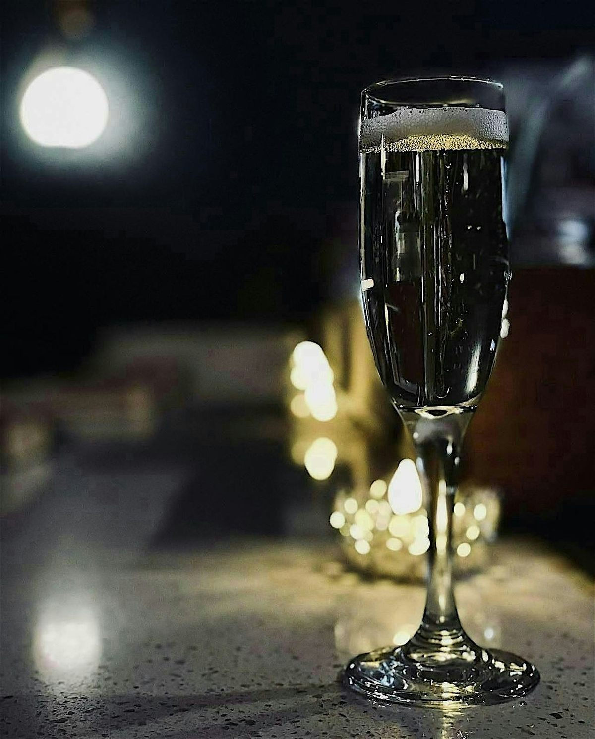 The private ticketed experience features a live DJ, welcome champagne toast, curated charcuterie, and a midnight countdown in an intimate, high-energy atmosphere.