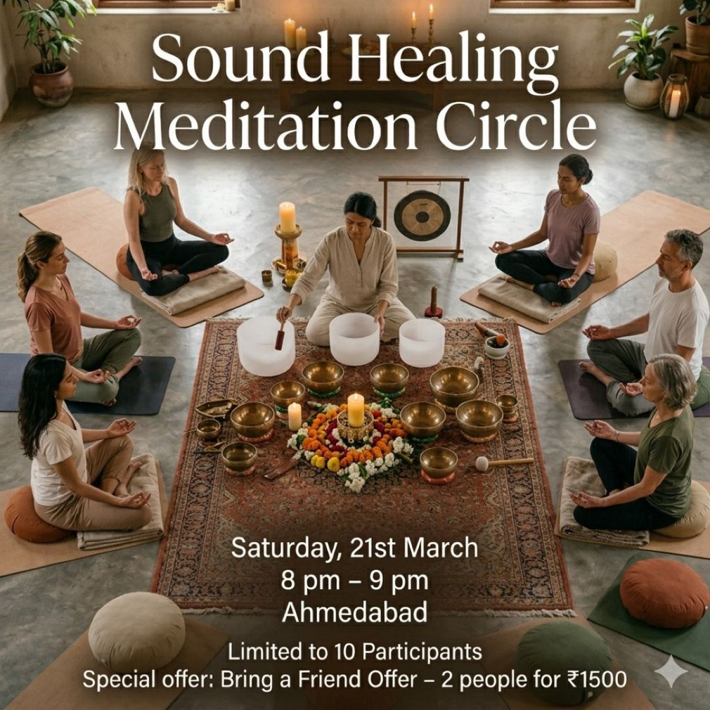 Join us for a transformative Sound Healing Meditation Circle. In this tranquil studio setting, bathed in soft natural light, we will utilize the powerful resonance of Tibetan singing bowls, Gong, Bell to release tension and promote deep relaxation.