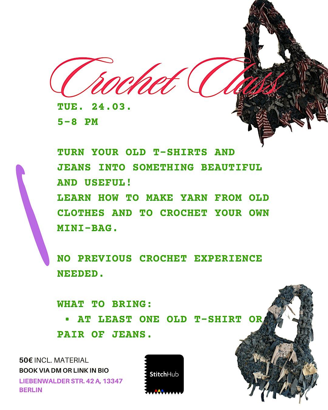 LEARN HOW TO MAKE YARN FROM OLD CLOTHES AND TO CROCHET YOUR OWN MINI-BAG.