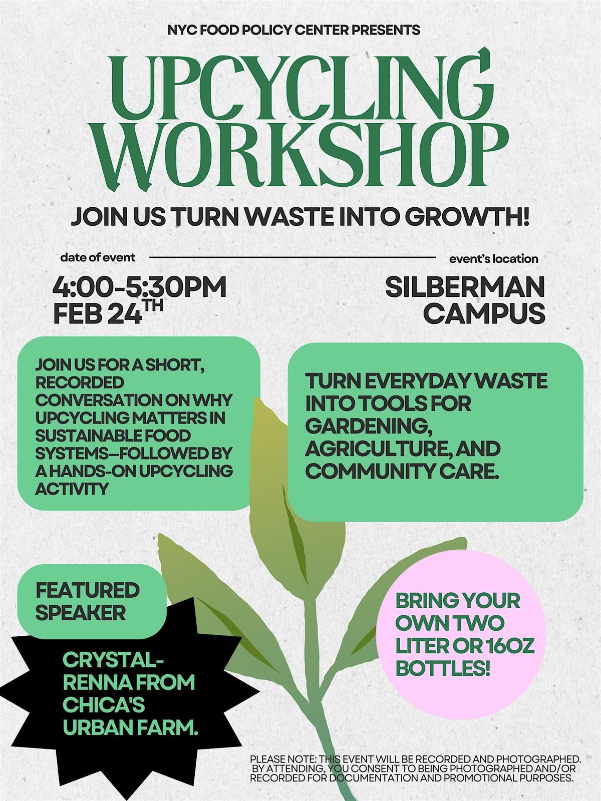 We will be talking with farmer Crystal-Renna from Chica's Urban Farm in Newburgh,NY who will also be leading us through a workshop on how to create our very own self-watering plant pots out of recycled plastic bottles.