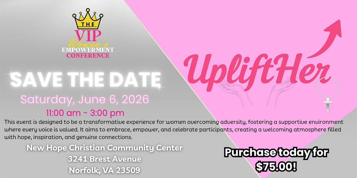 Come join us at the New Hope Christian Comm Center on June 6, 2026 at 11:00 AM for a day full of inspiration and connection. Whether you're looking to empower yourself or support others, UpliftHer is the place to be. Bring your energy, your smile, and get ready for some awesome moments with an amazing community. Can't wait to see you there!