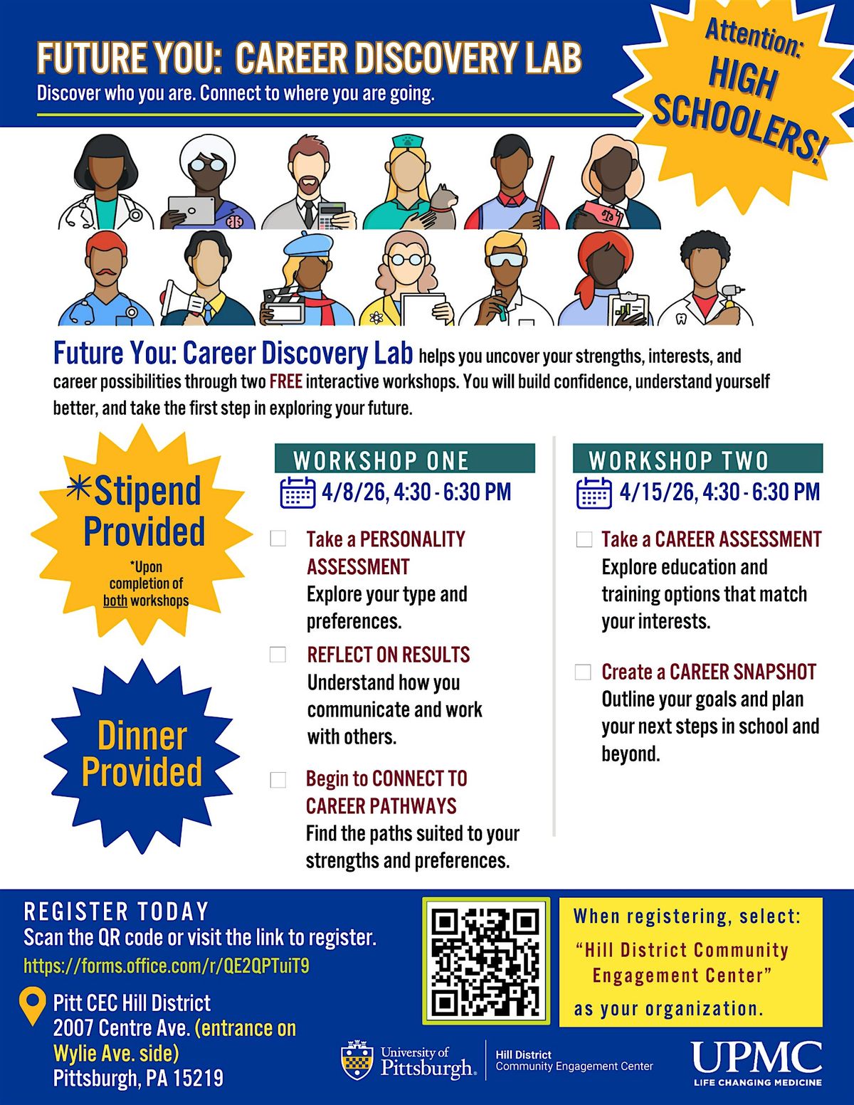 Future You: Career Discovery Lab, in partnership with UPMC, helps you uncover your strengths, interests, and career possibilities through two FREE interactive workshops. You will build confidence, better understand yourself, and take the first step toward exploring your future. Join and participate in both sessions (4/8/26 and 4/15/26) to receive a $100 stipend and certificate of completion. High schoolers only. Must attend and actively participate in both sessions. Dinner provided.