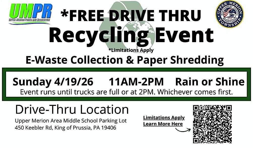 Our fifth annual Drive-Thru Recycling Event will be held on Sunday, April 19th from 11AM to 2PM in the Upper Merion Middle School LotAbout this Event