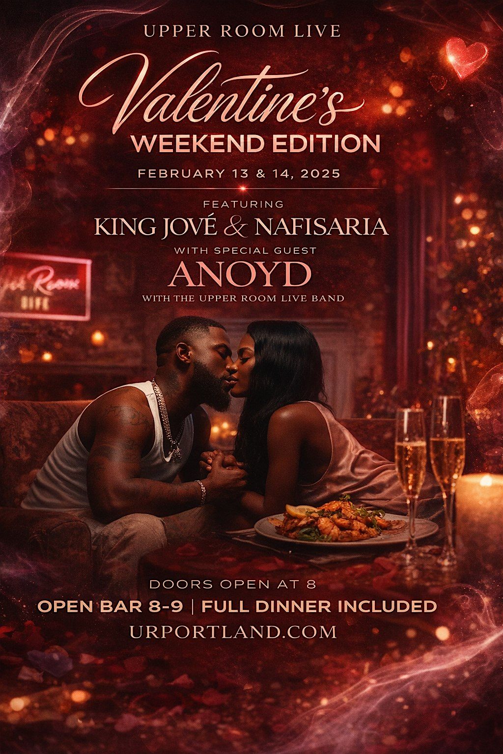 We’re turning Upper Room Portland into a full-blown vibe sanctuary, Single, Married or everything in between . This is not your average Valentine’s event. We’re bringing live band energy, a full-course dinner experience, and soul-shifting performances by Anoyd, Nafisaria, and Jové.