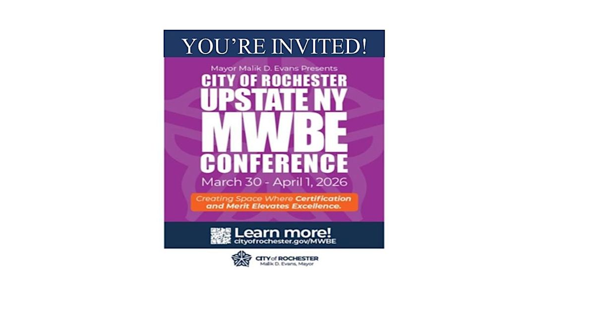 Hosted by the City of Rochester, the 4th Annual Upstate MWBE Conference will take place March 30 – April 1, 2026, at the Joseph A. Floreano Rochester Riverside Convention Center. This signature event brings together MWBE firms, government agencies, contractors, and resource partners from the Finger Lakes, Western New York, Central New York, and the Southern Tier.