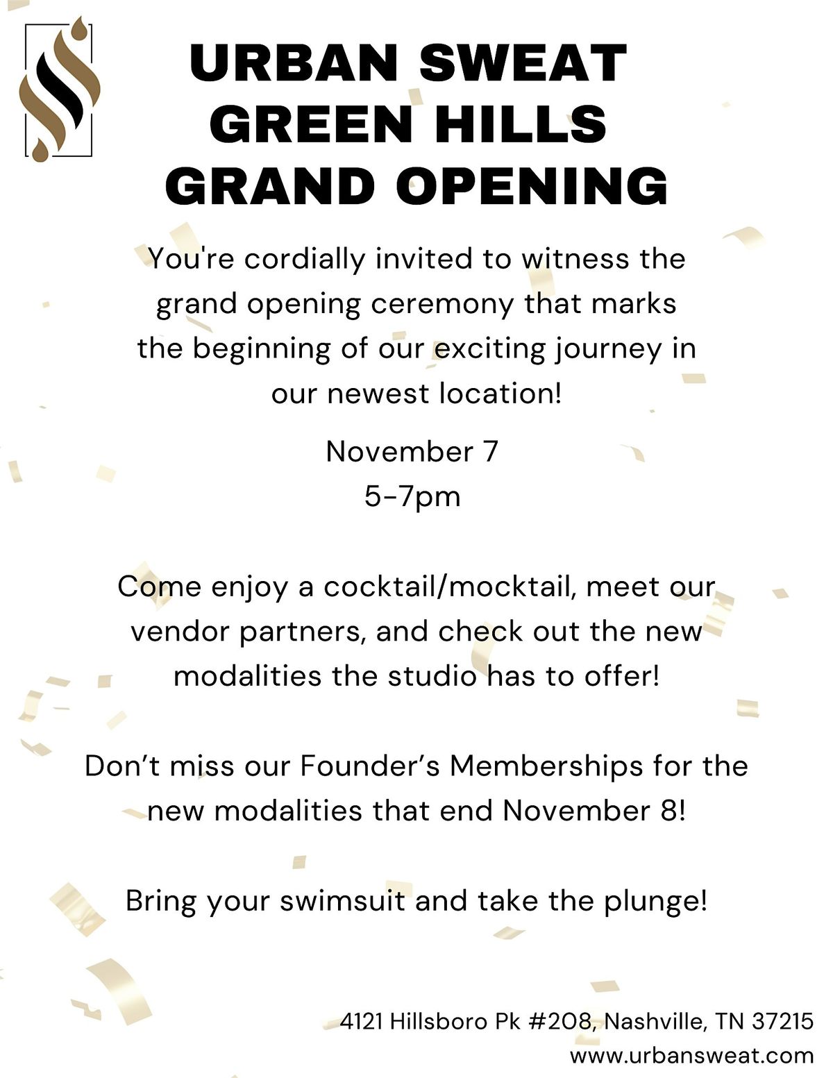 Join us at Urban Sweat Green Hills to celebrate our new location and services on November 7 from 5-7pm.About this Event