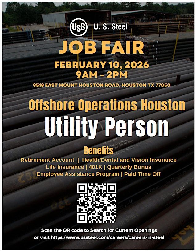 Looking for a new career opportunity? Join us at the U.S. Steel Houston Job Fair and meet face-to-face with our team. It's a great chance to explore roles, ask questions, and make connections in person. Don’t miss out on this awesome event to jumpstart your future with a leading company!
