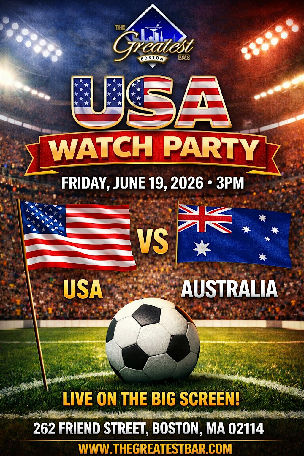 Join us at The Greatest Bar, Boston’s World Cup Headquarters, for an exciting USA vs Australia World Cup Watch Party.