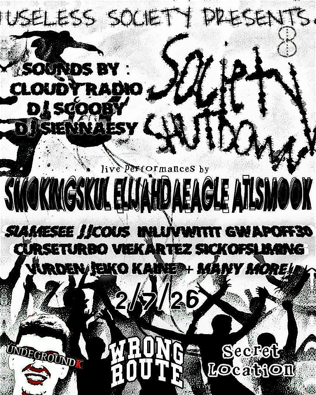 Info: Society Shutdown is a recurring underground music showcase presented by USELESS SOCIETY. This edition brings the movement to Atlanta, uniting both local talent and out-of-town artists to showcase their raw sound, individuality, and creative energy.