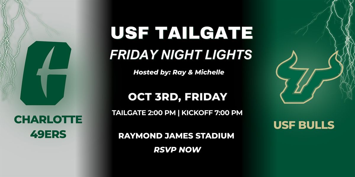 The Bulls are back home and ready for another big matchup! ๐๐ Join us for a Front Row Tailgate as USF takes on Charlotte. Kick off your weekend early with food, drinks, and Bulls spirit leading up to Fridayโs primetime showdown.