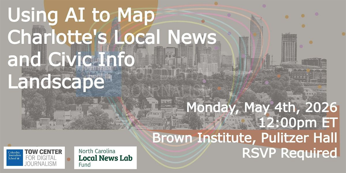 Join us on Monday, May 4 for an event on local news and new tools to map local civic information ecosystems. Using Charlotte, NC as a test case, we'll discuss new AI-driven methods for mapping local news and information. Tow Center Senior Research Fellow Sarah Stonbely will present findings from the research. She will then be joined by co-authors Michael Krisch (Brown Institute) and Dhrumil Mehta (Tow Center), as well as journalist and public policy expert Anna Brugmann (National Public Radio).