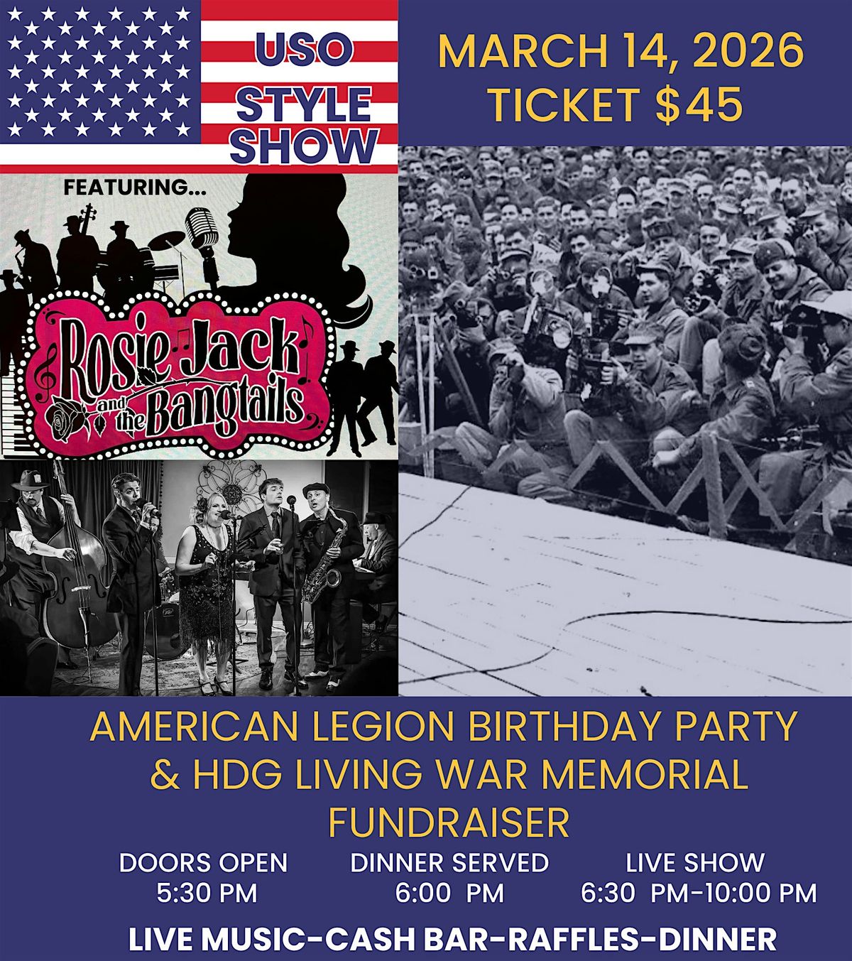 Live entertainment by Rosie Jack & the Bangtails. Light fare included with entry, cash bar. This is an event to celebrate the American Legion's 107th birthday and raise money for the Havre de Grace Living War Memorial and Museum. Event takes place in the hall and space is limited, please secure tickets in advance. Guests are encouraged to wear their service uniforms or dress in period costumes as Rosie Jack takes us on a tour of USO shows through time.