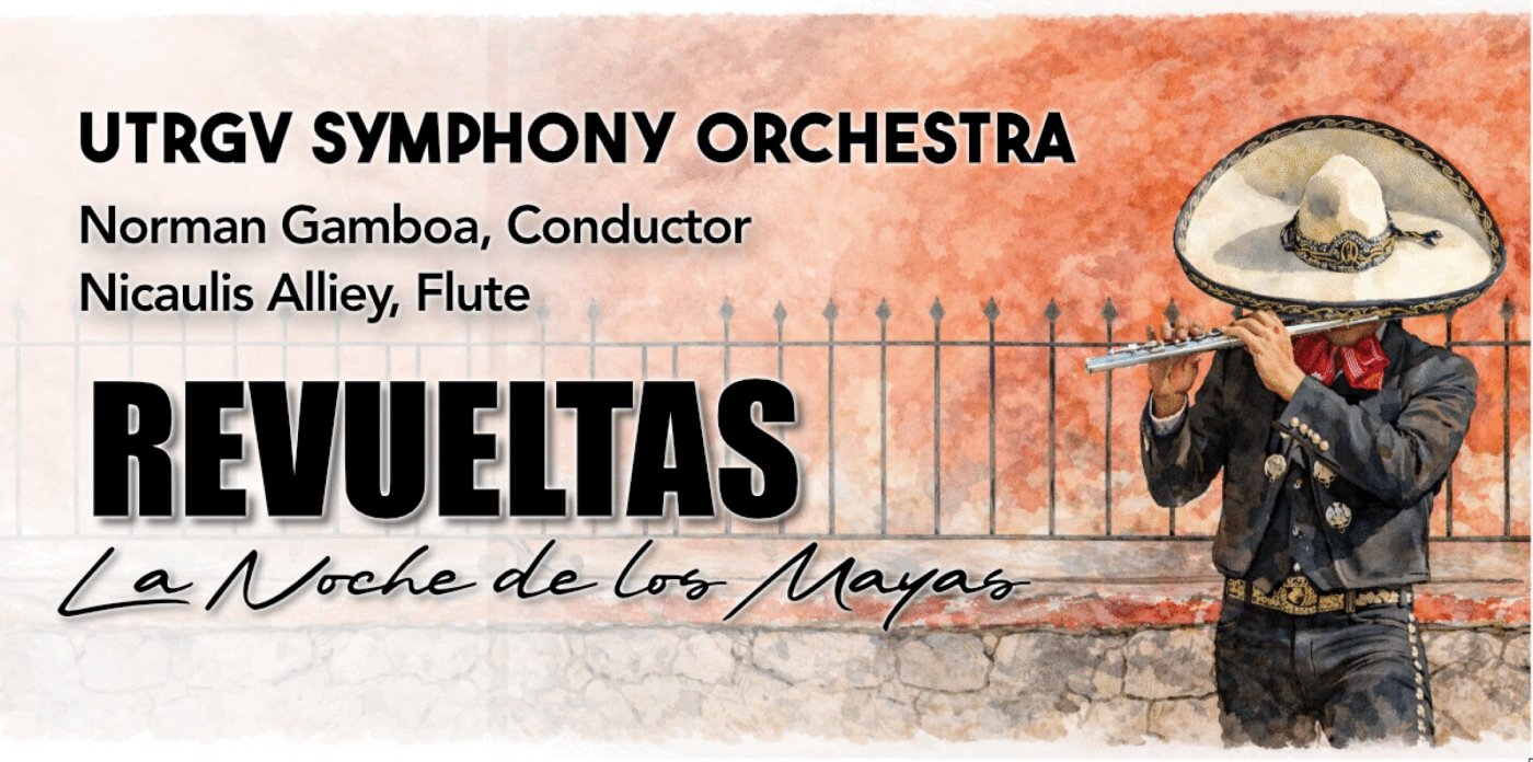 The UTRGV Symphony presents a preview concert of its debut program of leading Mexican composers for the Texas Music Educators Convention in San Antonio, featuring music from the 1939 Mexican film La Noche de los Mayas, also Kauyumari by Gabriela Ortiz, and Concierto de Minería by Samuel Zyman with flute soloist Nicaulis Alliey.