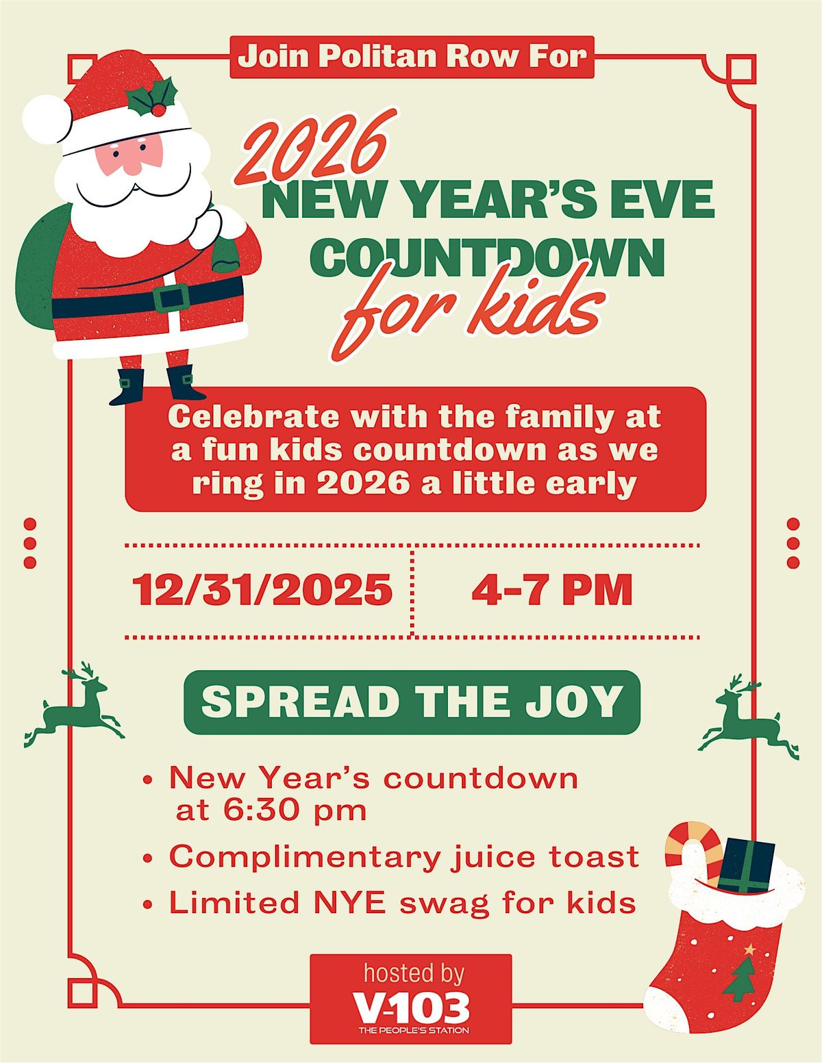 Come enjoy the NYE celebration with the little ones this year at Politan Row Colony Square hosted by V103! Comp juice toast at 6:30pm!About this Event