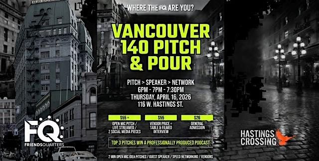 Pitch your idea, meet creators, enjoy drinks & networking. Vancouver 140 celebration at Friends Quarters. Limited spots!