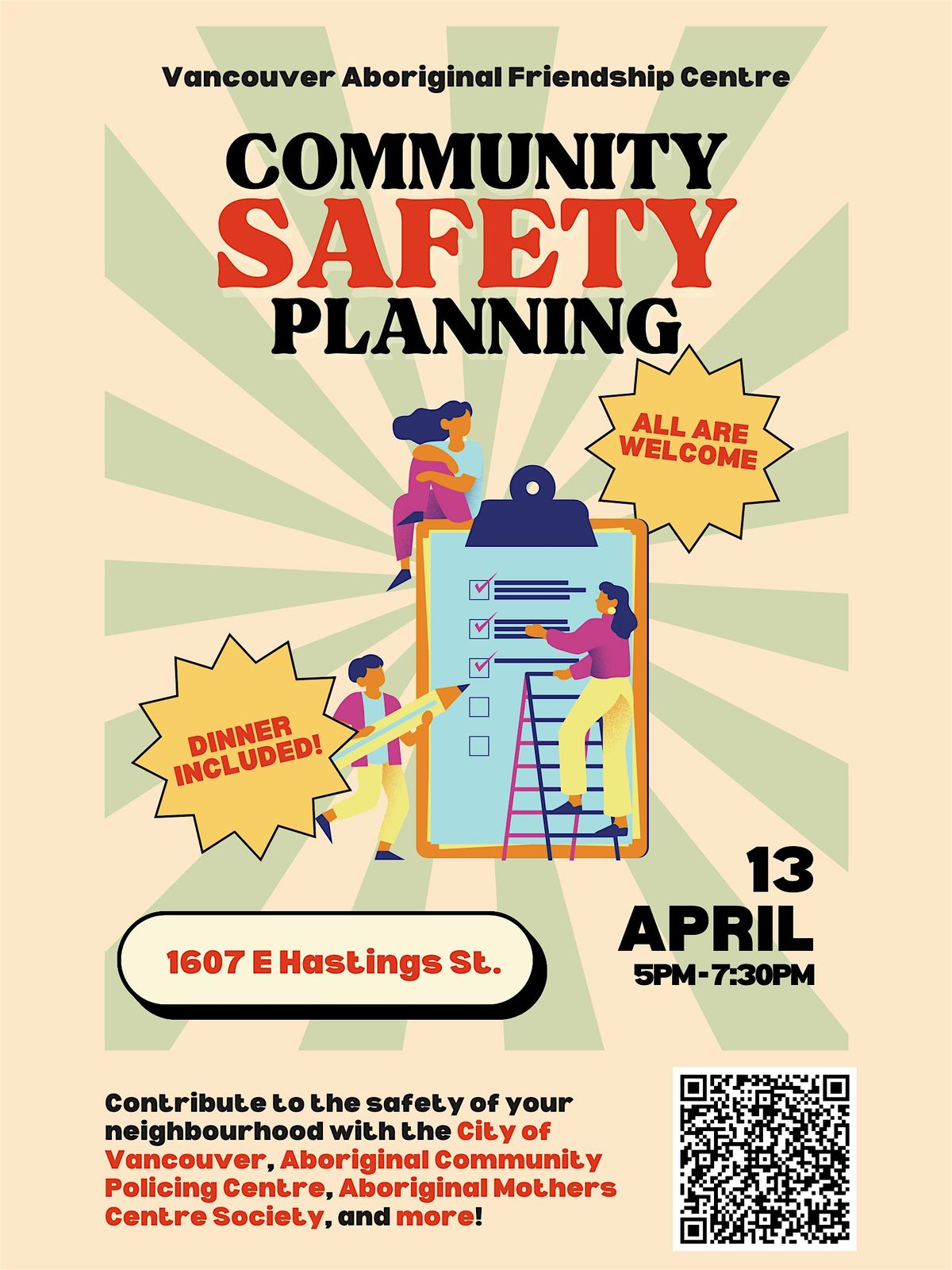 This community event is an opportunity for participants to contribute to a Community Safety Plan (CSP) for the neighborhood alongside partners like VAFCS, the City of Vancouver, Aboriginal Community Policing Centre & Hastings Sunrise CPC, Aboriginal Mothers Centre Society, and Metro Vancouver Aboriginal Executive Council.