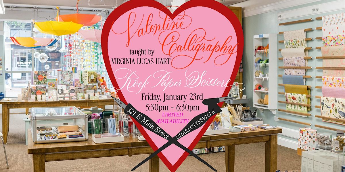 This one-hour adult workshop will be led by local calligrapher, Virginia Lucas Hart of virginialucashart.com / @ihartvirginia, and is designed for anyone interested in learning basics of pointed-pen calligraphy and creating a beautiful penned Valentine.