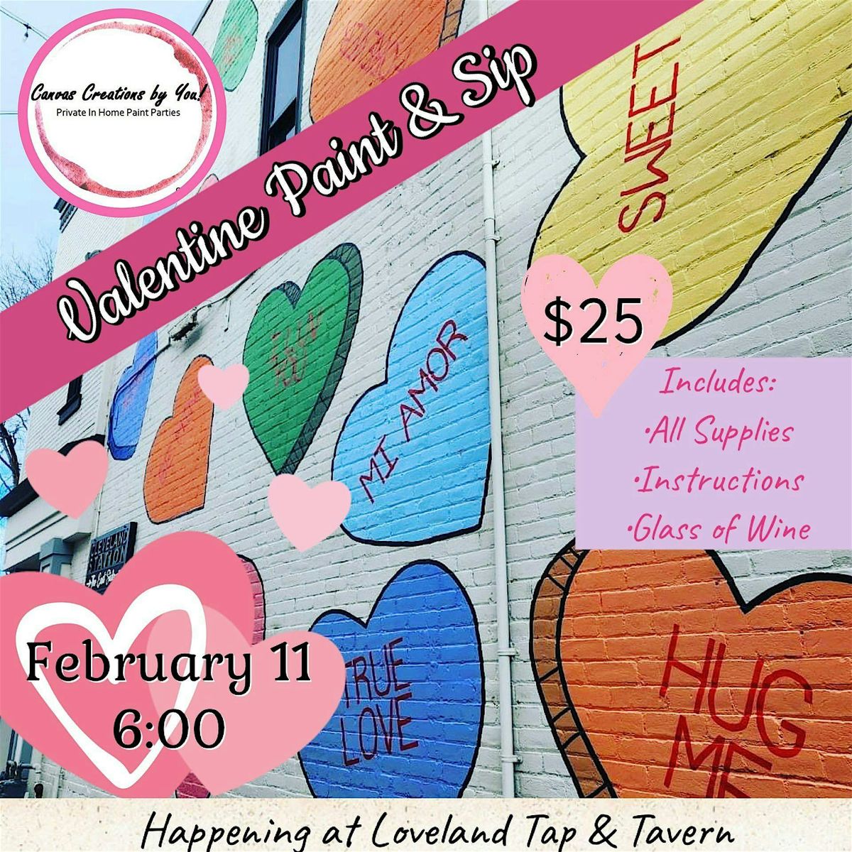 Love is in the Air~ Get ready to unleash your inner artist in a relaxed vibe. Paint, Sip and Create. Whether you're coming with a date or flying solo, it's all about having a blast and making cool art. Gather the gals or pals for an evening filled with good times~ Let your creativity flow!