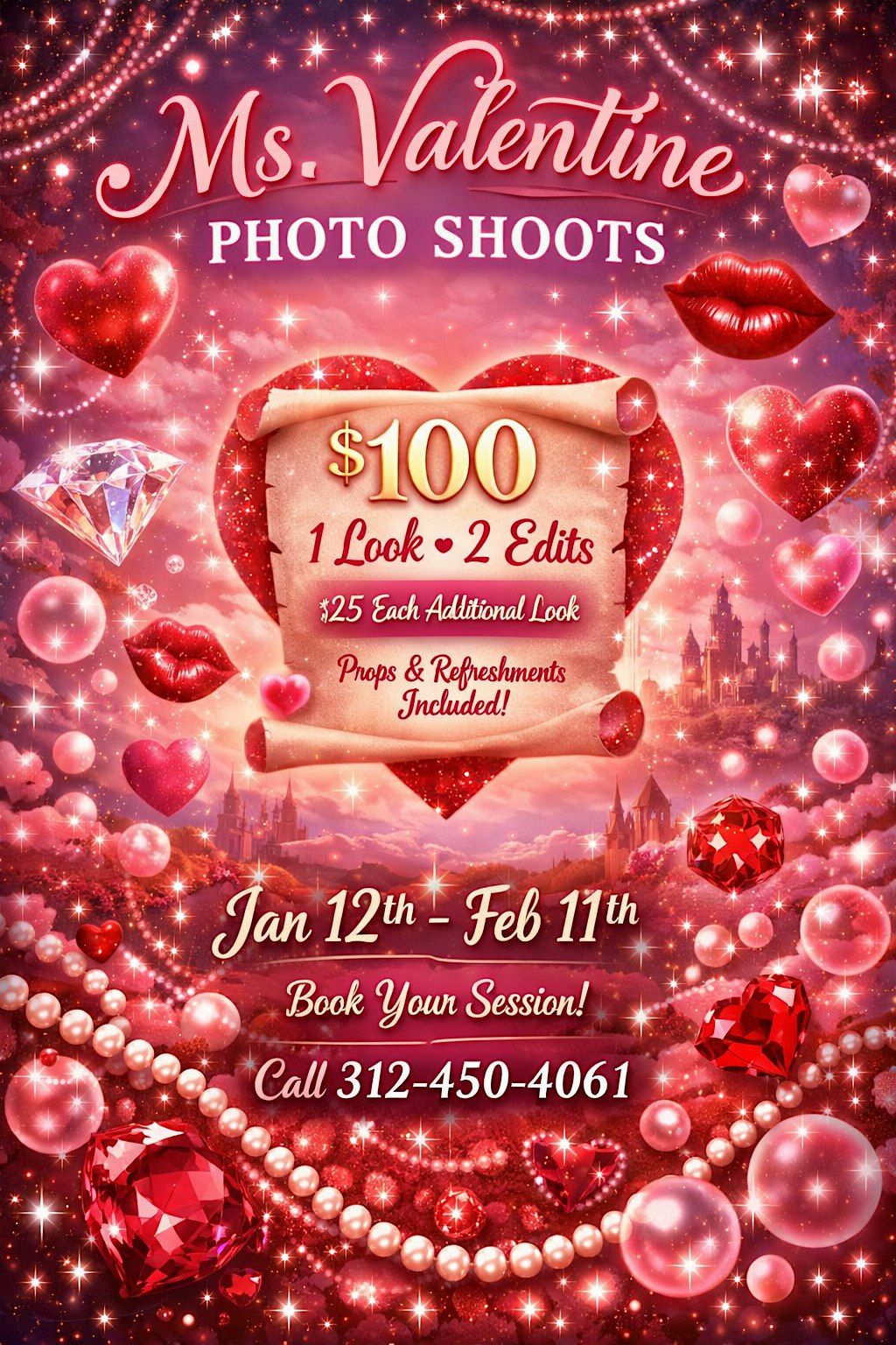 From January 12th to February 11th, we’re offering a one-of-a-kind Valentine-themed photo shoot experience that blends glamour, mystery, and whimsy. Whether you're capturing self-love, romantic vibes, or just want to sparkle in a world of pearls, rubies, and floating kisses — this is your fantasy playground!