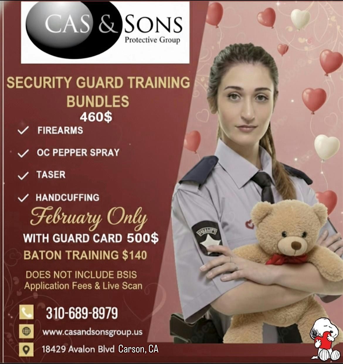 CAS and Sons Protective Group is offering a Valentine Special! Training Bundles do not include state application fees, live scan fees or pysch evaluation fees. MUST register in order to attend class. Call or email us for any questions 310.689.8979 or c[email protected]