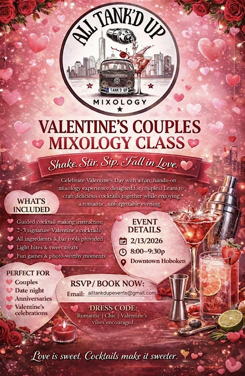 Get ready to shake things up this Valentine’s Day with our fun and interactive Couples Mixology Class! Join us in Hoboken, New Jersey and learn to craft delicious cocktails side by side with your special someone. No experience needed—just bring your love and a splash of curiosity. Cheers to a night full of laughs, tasty drinks, and great memories! Light charcuterie and sweets provided.