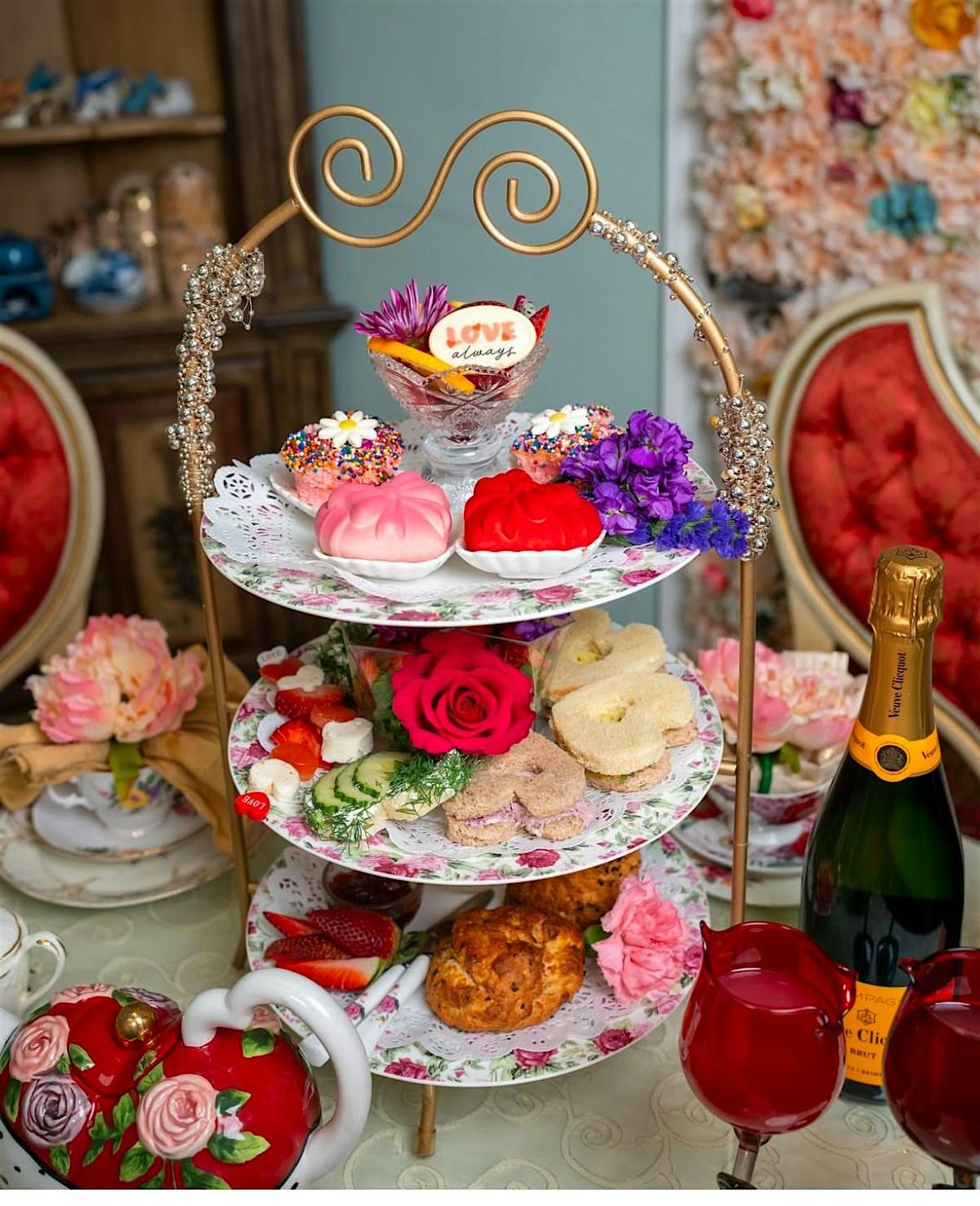 A Valentine's Day afternoon tea offersa romantic, themed spread of delicate savories, sweet pastries, and fine teas, often with heart shapes, red/pink colors, and romantic flavors like rose or chocolate, served elegantly on tiered stands with classic scones, clotted cream, and preserves, perfect for intimate dates or Galentine's gatherings. Expect classic finger sandwiches (perhaps with cranberry or strawberry), freshly baked scones, deserts, chocolate treats, and special blends like rose or vanilla teas, presented in an elegant, festive setting.