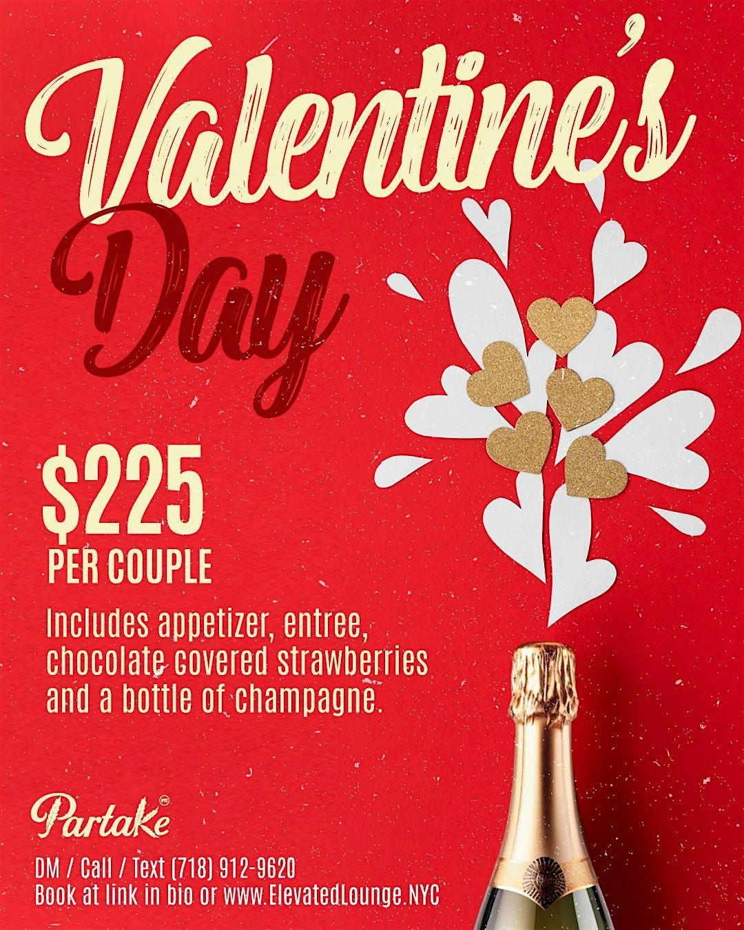 Celebrate Valentine's Day at NYC's hottest lounge, Elevated at Partake! Enjoy an unforgettable evening with your loved one, featuring live DJs playing R&B hits all night long. We're offering exclusive dining packages designed for a romantic night out.Ticket Options: