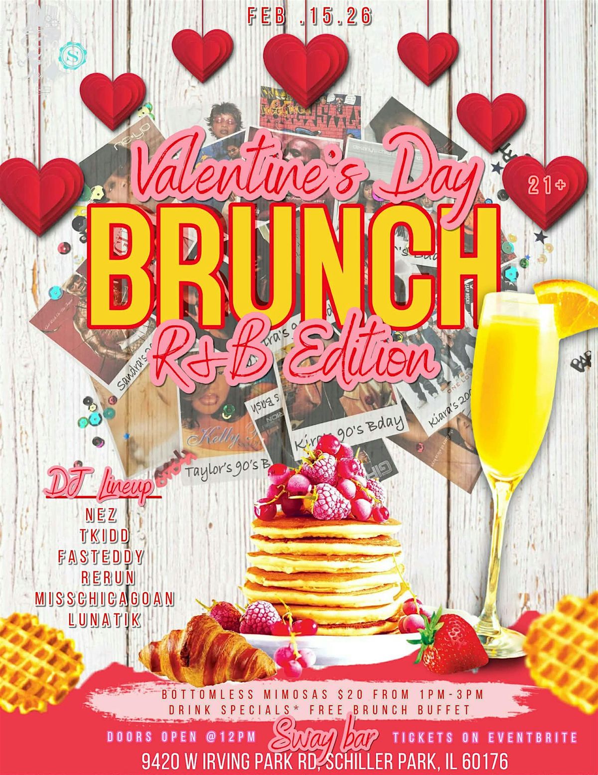 Welcome lovebirds! Join us for the Valentine's Day Brunch - R&B Edition at SWAY BAR. Get ready to groove to some smooth R&B tunes while enjoying delicious brunch offerings. Let's make this Valentine's Day extra special with good music and great company.