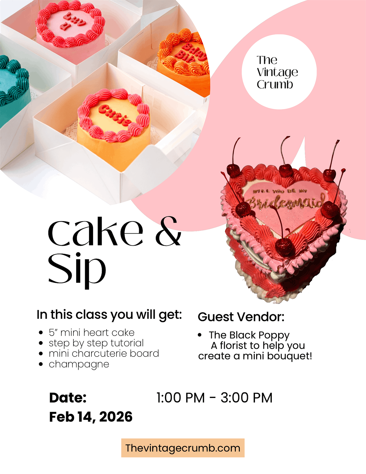 Join us for a sweet and cozy Valentine’s Day Cake & Sip at Studio Luz in Vallejo from 1–3 PM! You’ll decorate your very own 5 in. mini heart cake with step by step guidance! No experience is needed, just come ready to have fun!