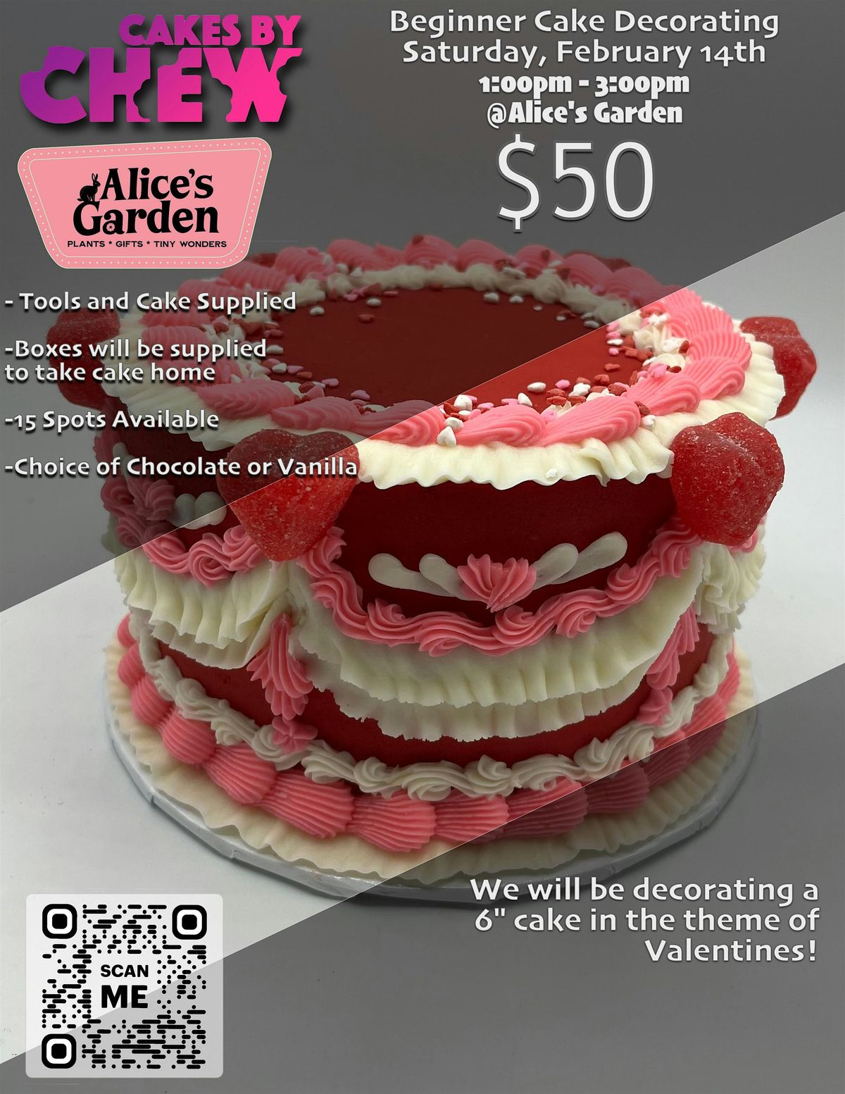 Join us for a fun and sweet Valentine's Day cake decorating class! Whether you're a beginner or a pro, we'll help you create a beautiful, delicious cake perfect for sharing with your Valentine. Bring your creativity and get ready to make stunning treats that'll impress your special someone. Don't miss out on this hands-on experience—let's bake some memories together!