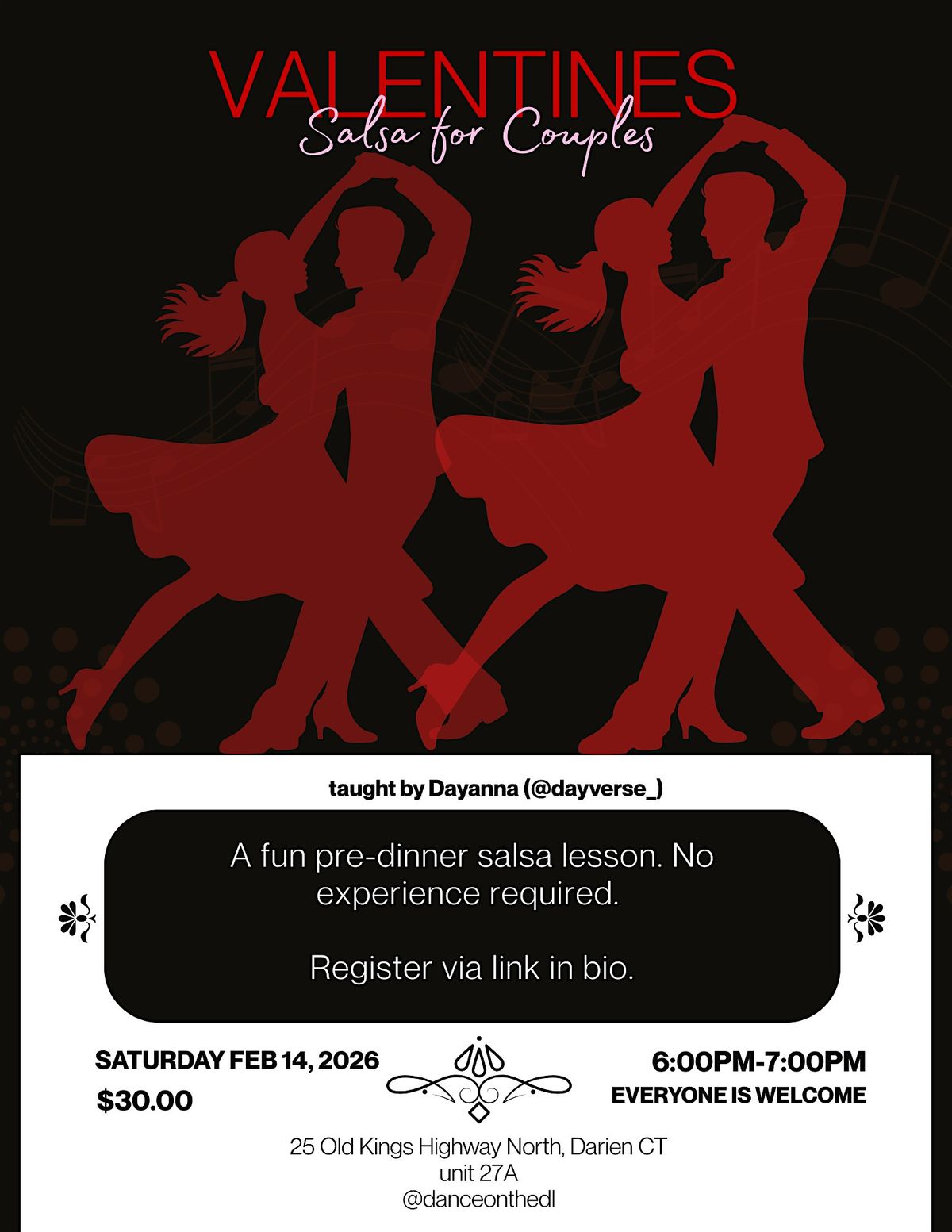 a fun valentines day salsa lesson for couples looking to set to the tone right for the rest of the night! The perfect bonding experience!