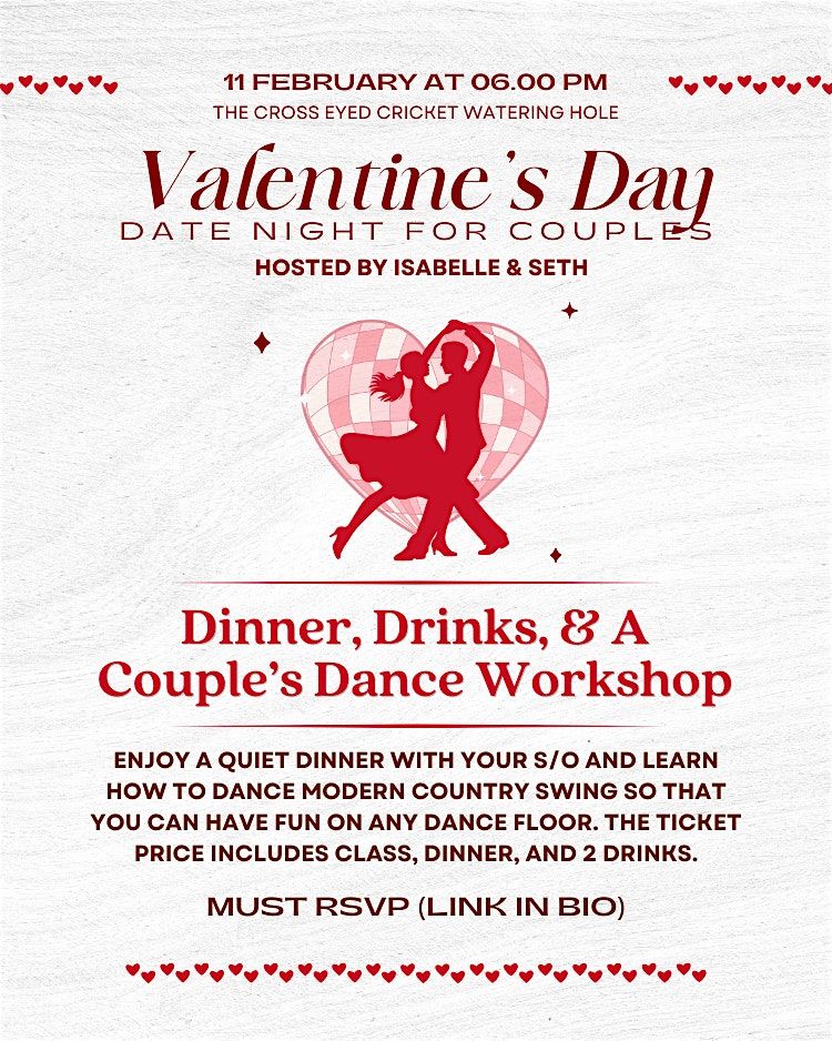Come to the Cross-Eyed Cricket for a relaxed, mid-week couples dance experience designed for couples who want connection without the overwhelm of large group classes. This is a small-group, guided couples lesson in a quieter bar setting, followed by open dancing.