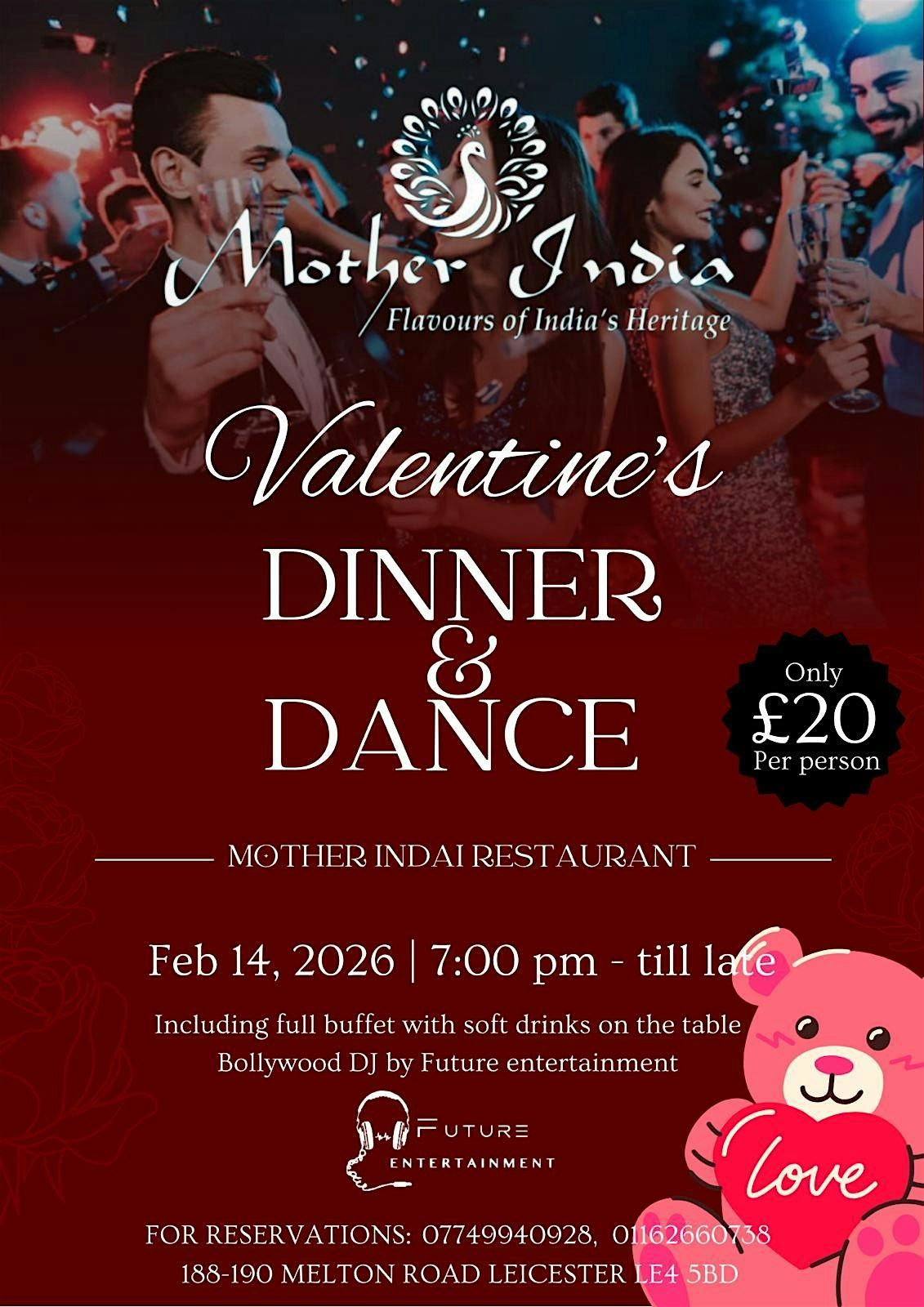 Looking for a perfect way to celebrate Valentine's Day? Join us for an unforgettable night with delicious food and groove-worthy tunes at Mother India. It's all about good vibes, great company, and a cozy in-person experience that you'll love. Don’t miss out on this special evening filled with love, laughter, and dancing. Bring your special someone and make memories that last!
