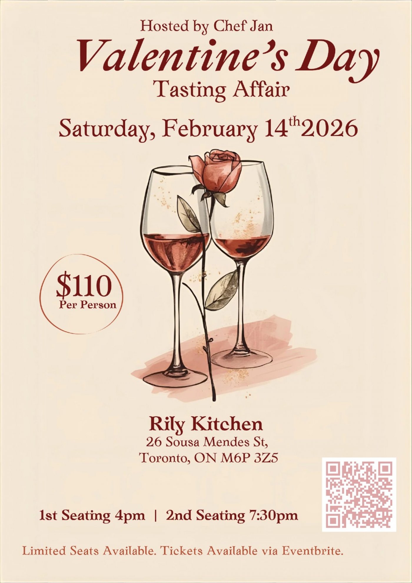 Guests can choose between two seatings at 4:00 PM or 7:30 PM, with tickets priced at $110 per person. With limited seating available, this elevated dining experience offers a bold and memorable way to celebrate love.