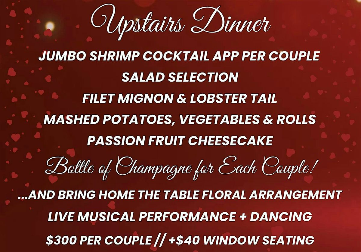 Happy Valentine's Day! Join us for two exclusive upstairs seatings for our Valentine's Event: a sunset 5:45pm seating, and a twilight 7:45pm seating - for candlelight dining with a view in our upstairs ballroom!