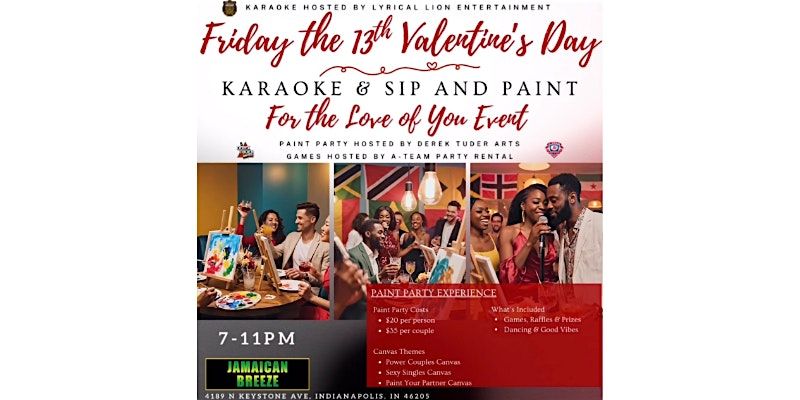 karaoke night, karaoke party, valentines day event, valentines day party, friday the 13th party, sip and paint event, paint and sip, karaoke and sip and paint, singles valentines event, couples valentines event, Indianapolis events, Indy nightlife, Indianapolis nightlife, Indy karaoke, Indianapolis karaoke, Jamaican Breeze Indianapolis, Indianapolis valentines events, things to do in Indianapolis, grown and sexy vibes, date night ideas, singles night, couples night out, black owned businesses, black nightlife, black culture events, millennial nightlife, urban nightlife, jamaican food, caribbean food, jamaican cuisine, drink specials, no cover events, free parking events