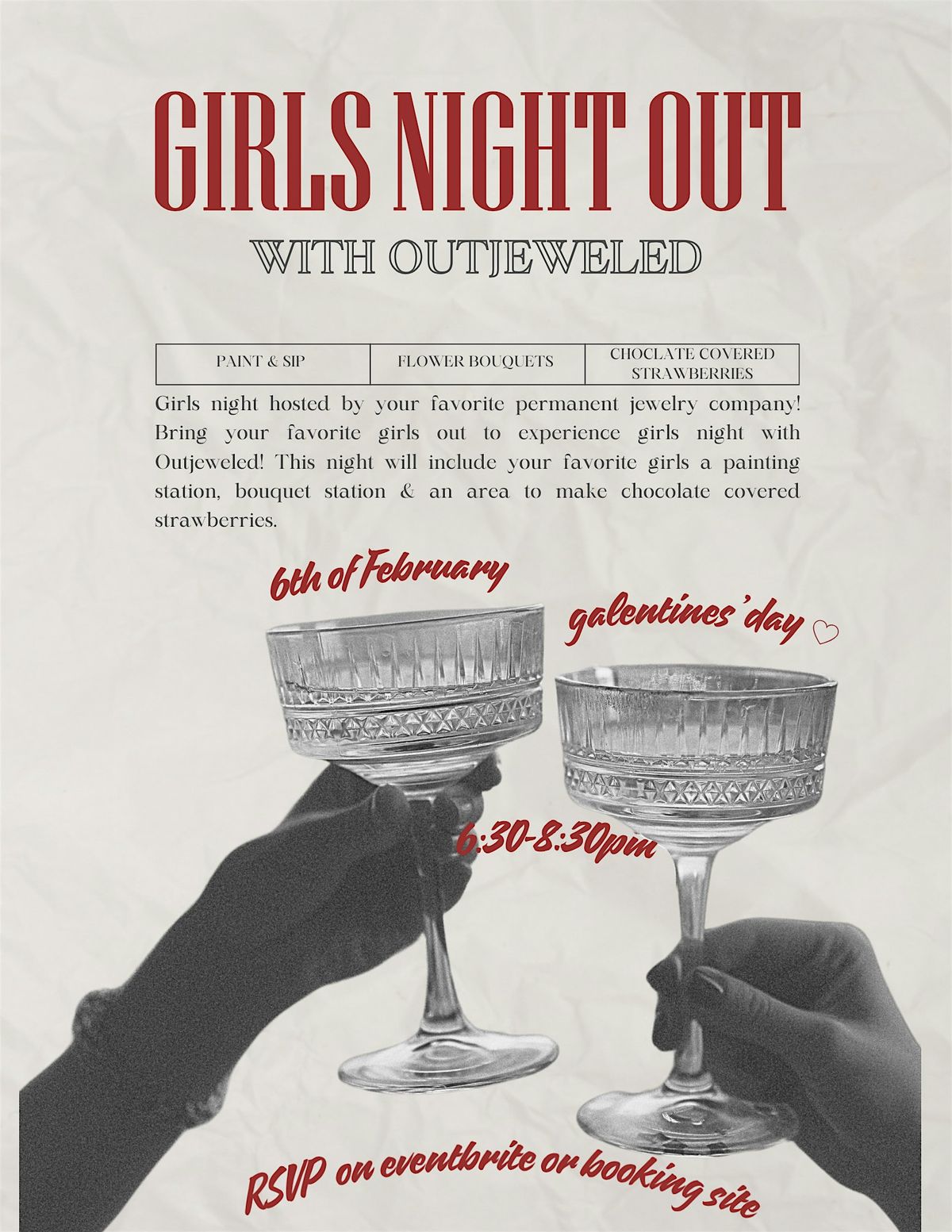 Girls night hosted by your favorite permanent jewelry company! Bring your favorite girls out to experience girls night with Outjeweled! This night will include your favorite girls a painting station, bouquet station & an area to make chocolate covered strawberries.