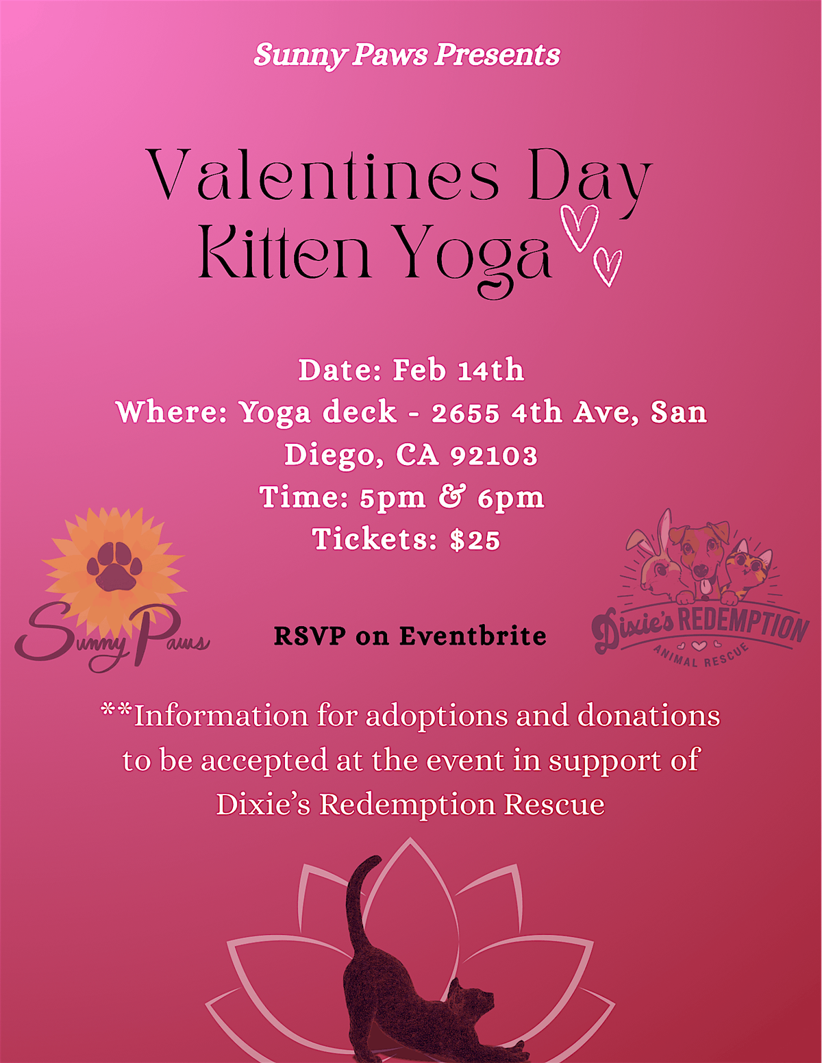 Get ready for a purrfect way to spend your Valentine's Day! Join us in person for Valentines Day Kitten Yoga, where you can stretch, relax, and cuddle adorable kittens all at once. It's the ultimate combo of relaxation and cuteness overload.