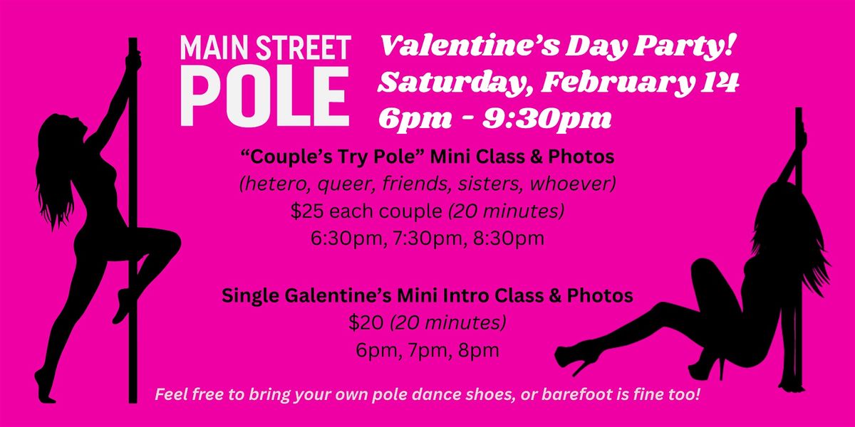 Grand Opening Valentine’s mini pole sessions! Couples + Galentine’s. Beginner-friendly, fun, photos, all ages welcome. 20 min. sessions!