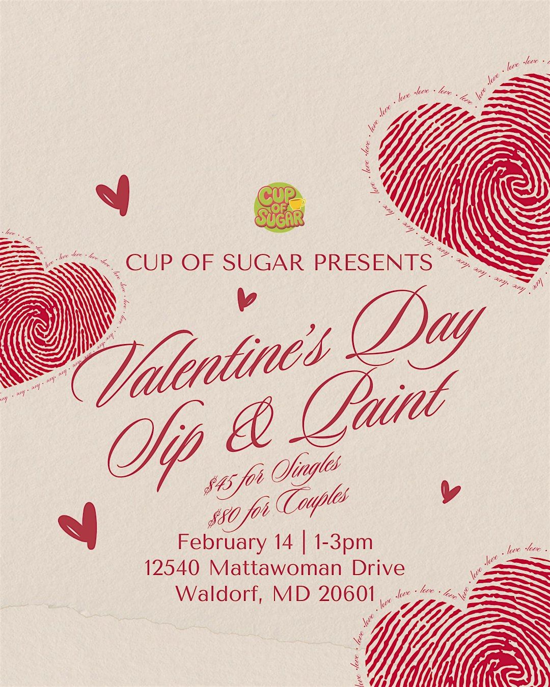 Spend Valentine’s Day getting creative at Cup of Sugar’s Sip & Paint on February 14 from 1–3pm. Whether you’re coming solo, with a partner, or celebrating friendship, this relaxed afternoon is all about fun, creativity, and good vibes.