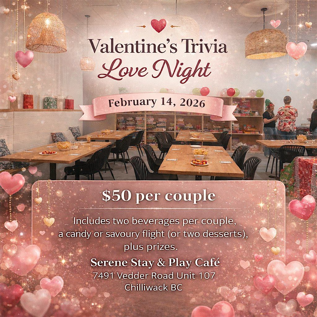 Get ready for a fun night at our Valentine's Day Trivia Love event! Join us in person to test your knowledge about all things love, romance, and Valentine's Day. Whether you’re bringing a friend or your sweetheart, it’s the perfect way to celebrate with laughs, friendly competition, and a great crowd. Don’t miss out on the chance to show off your trivia skills and maybe even win a little something special. Prices include 2 beverages, a flight or 2 desserts, daily game fees, and prizes (see FAQ for more details) See you there!
