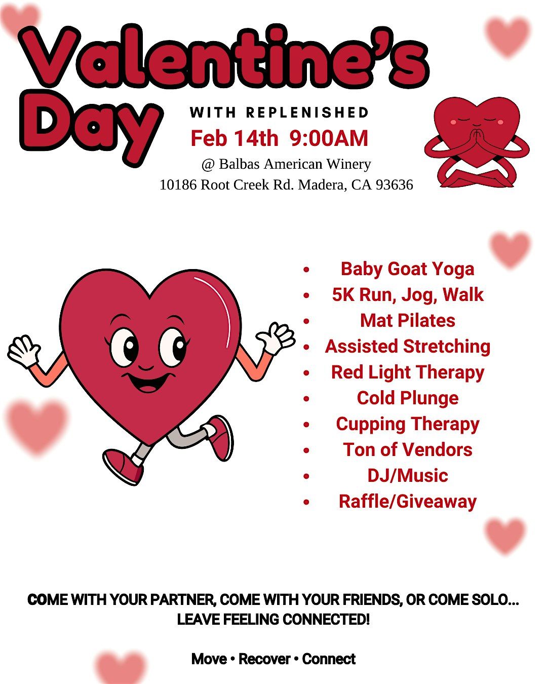 Valentine's Day with REPLENISHED is a Valentine’s social wellness experience. Designed for singles, couples, and friends, this event blends baby goat yoga, cold plunging, recovery, pilates, music, and interactive challenges into a fun, pressure-free day of connection.