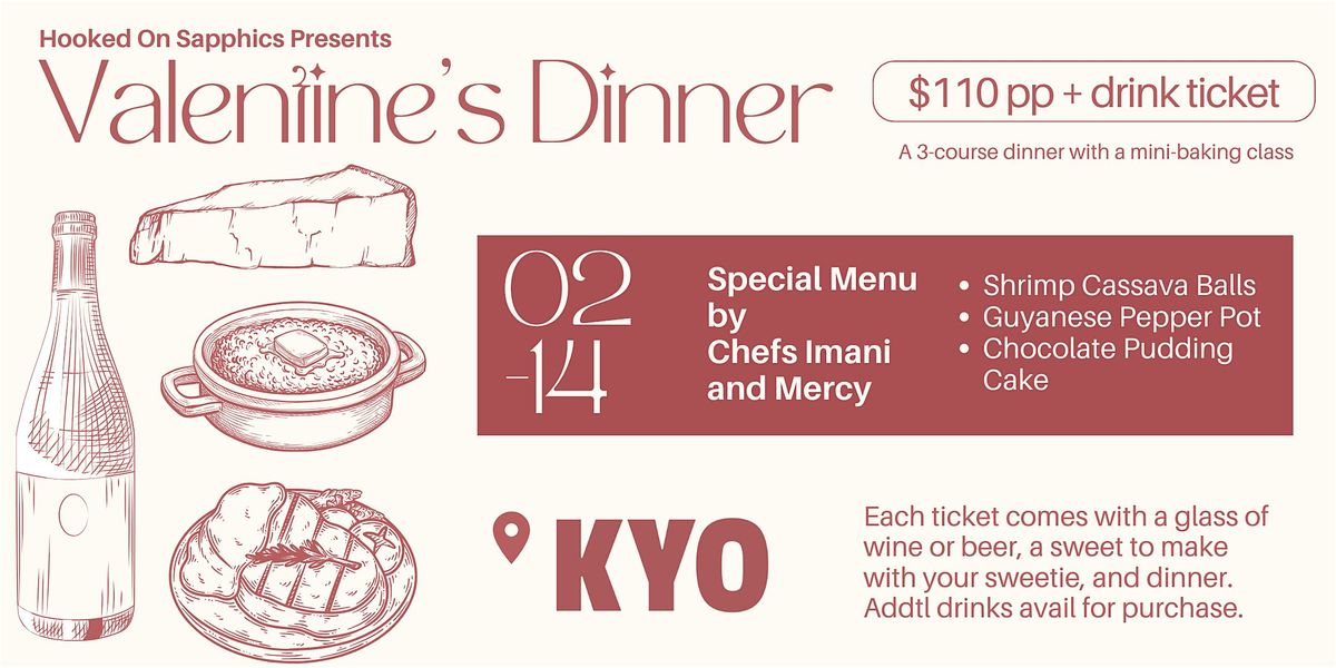 - Enjoy a delicious pre-fixe menu curated by Chefs Imani and Mercy including Shrimp Cassava Balls, Guyanese Pepper Pot, and Chocolate Pudding Cake
